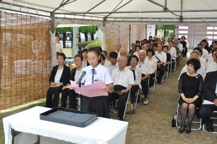 山内梨緒さん(島二小6年)は「二度と戦争を起こさないために私たちができることは、戦争の恐ろしさを伝え続けていくこと。そして、今何不自由なく生活できていることに感謝し、周りの人への思いやりを忘れずに生きていきたい」と平和への思いを読み上げました。