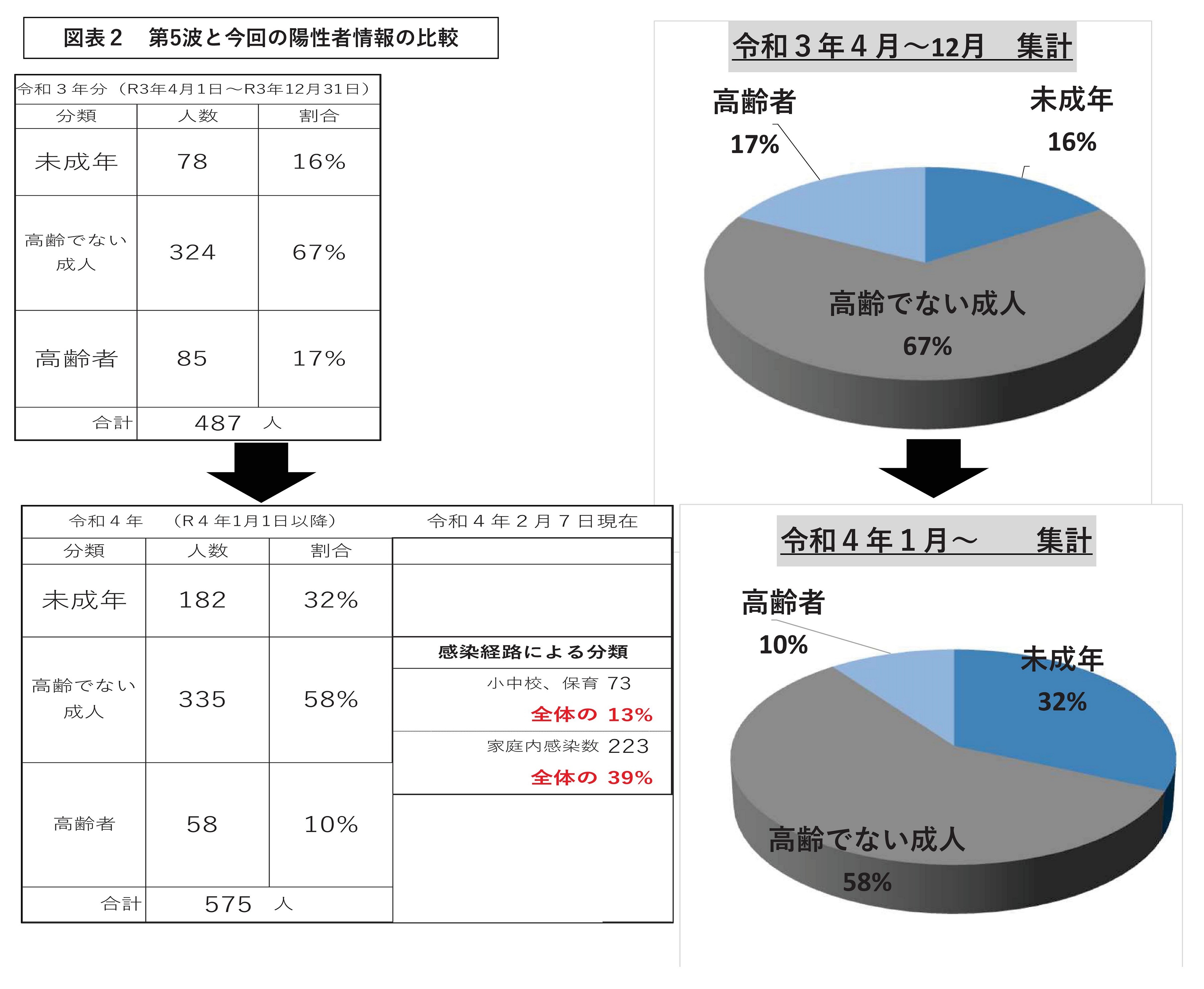 - 第5波では、陽性者は「高齢でない成人」が3分の2(67%)を占めていたが、今回は「未成年者」が非常に多く(5波:16%→今回:38%)、いまのところ高齢者が少ない。